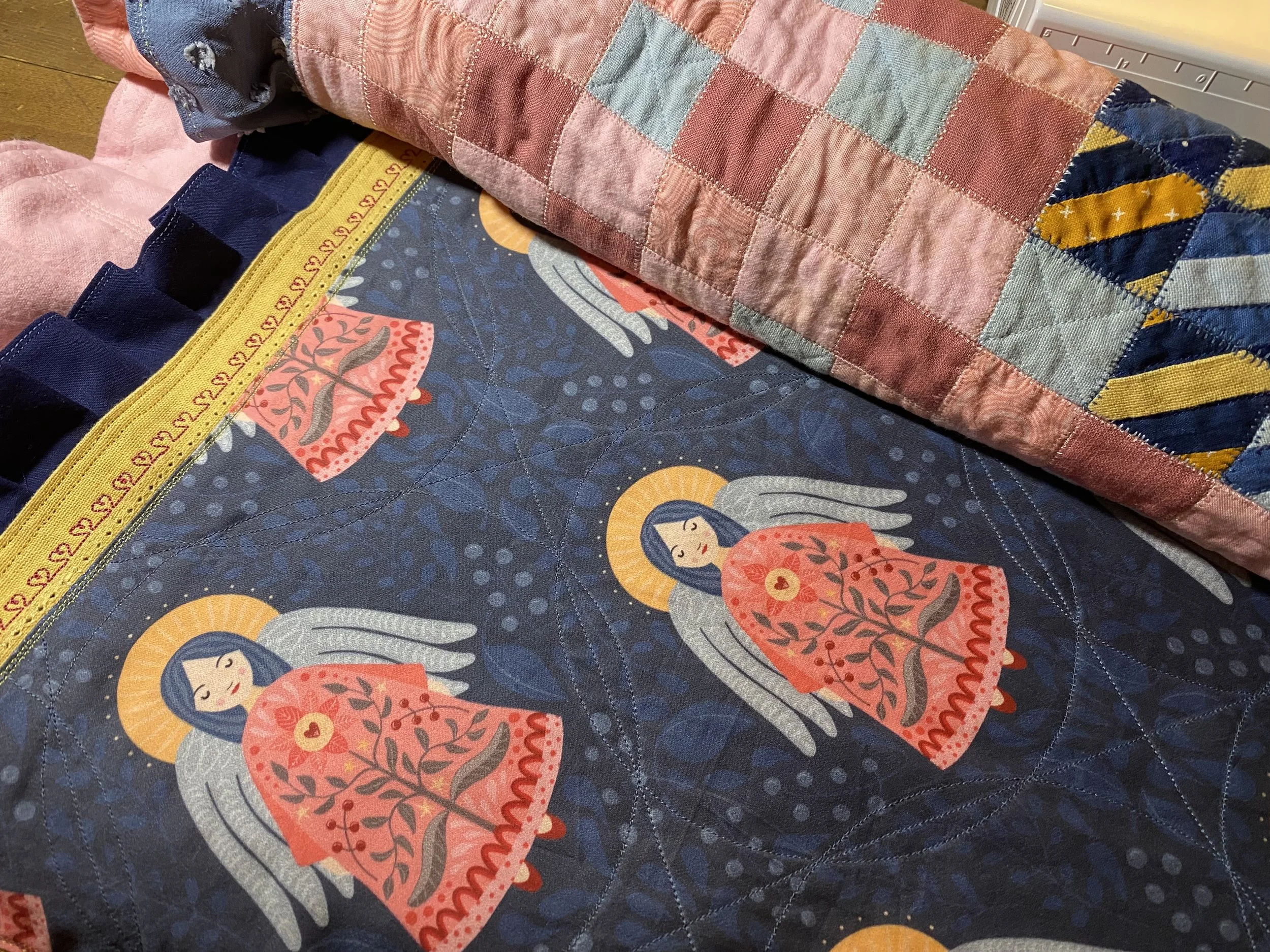 As a long-past therapy of sorts, I thought I would recreate an ‘adult’ version of it. I see the one I’m working on now as being a sort of ‘prayer blanket’. I’ve done a little bit of research on this, and it seems fitting. There are a number of types of uses/creation methods for these… and the intention of use. I think I would also like to print/iron/sew a number of Bible verses between the front & back layers (that I have yet to attach together).