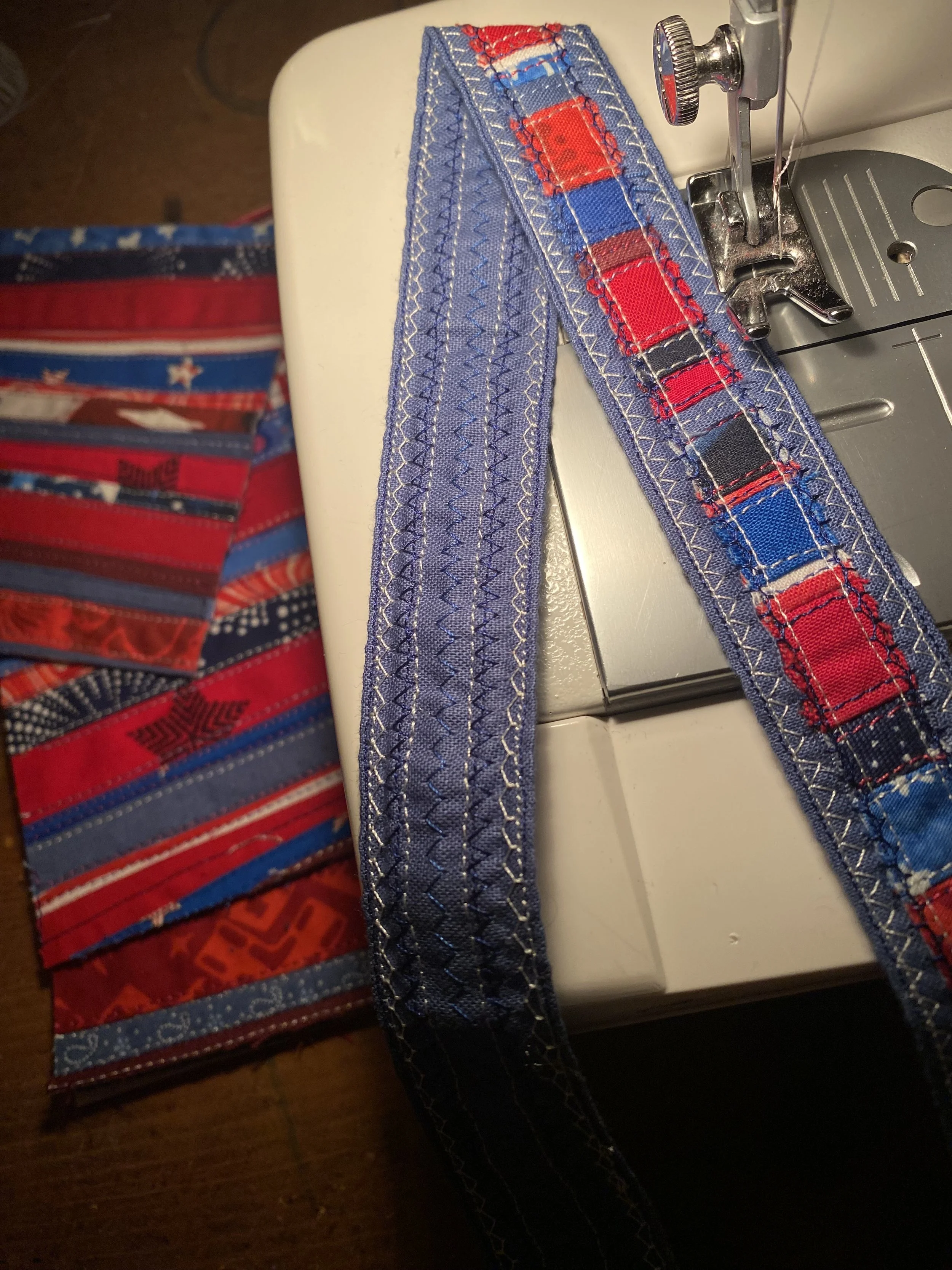 After completing my first group of fabric wristlet keychains, as I was tidying up my little work area, I gathered up a nice handful of what I thought were pieces of ‘trash’… my leftover little pieces of scraps. These had been trimmed off when cutting from my initially prepared duplexed fabric pieces for creating patriotic themed keychain pieces.