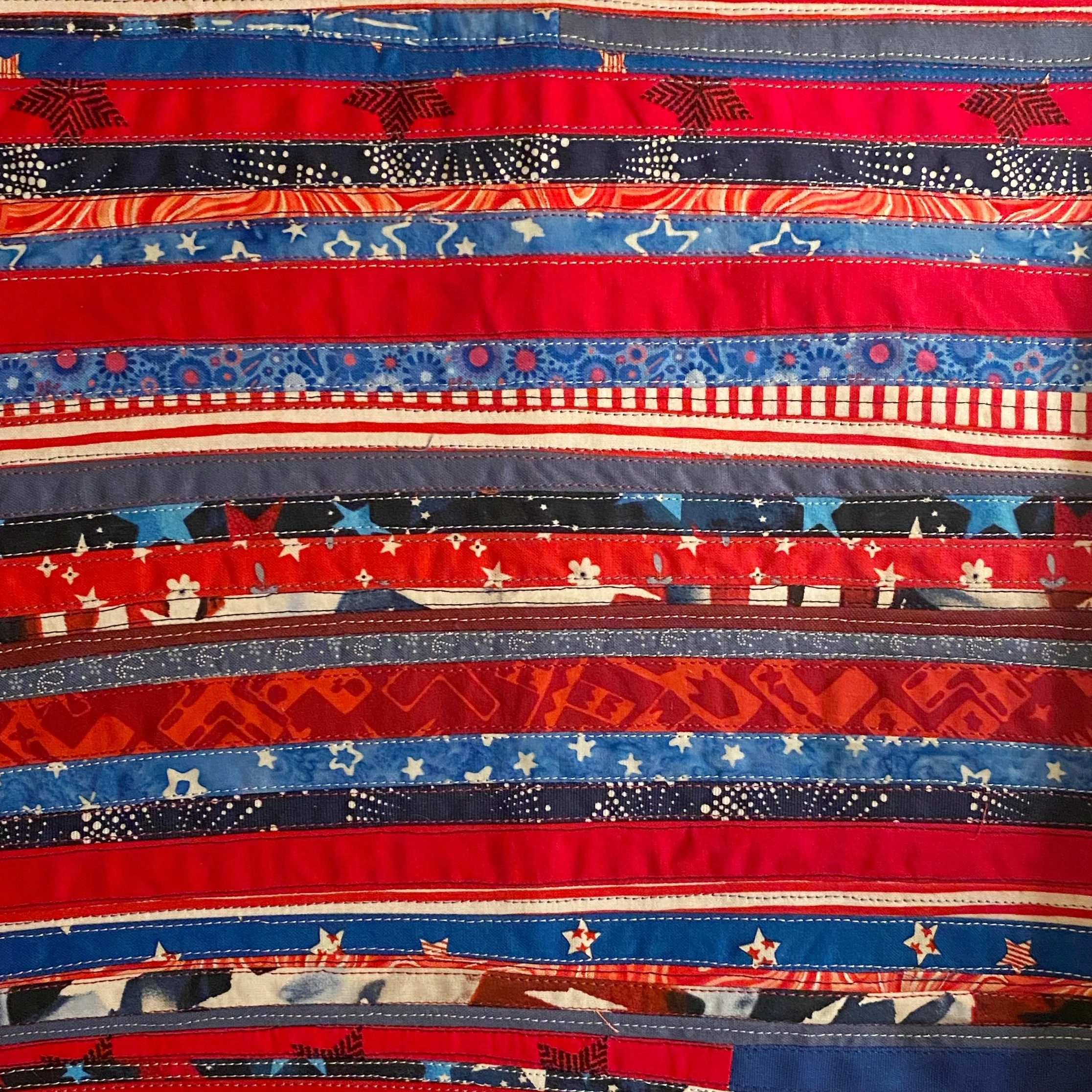 The combined grouping of colors & patterns looked so pretty in my hands, I just could not walk them to the trash. But, what could I do with them? I decided I would try to stitch them all together… and just see.